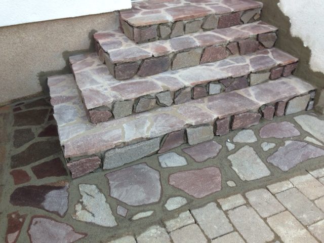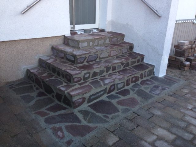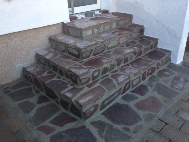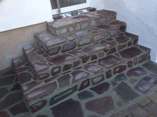 Zwei Streifenfundamente wurden hergestellt und auf entsprechende Höhe aufgemauert. Die Treppenstufen wurden auf entsprechendes Maß neu verschalt und zur Verstärkung Bewährungseisen verlegt und gebunden. Danach wurde die Treppe neu betoniert. Nach einer entsprechenden Erhärtungszeit wurde die Treppe ausgeschalt. Natursteinplatten wurden in Mörtel auf entsprechendes Maß neu verlegt und nach Erhärtung verfugt.
